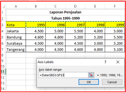 Kemudian klik Edit, lalu pilih tahun seperti terlihat pada gambar di bawah ini, yaitu pilih dari range B3 sampai F3 lalu klik OK